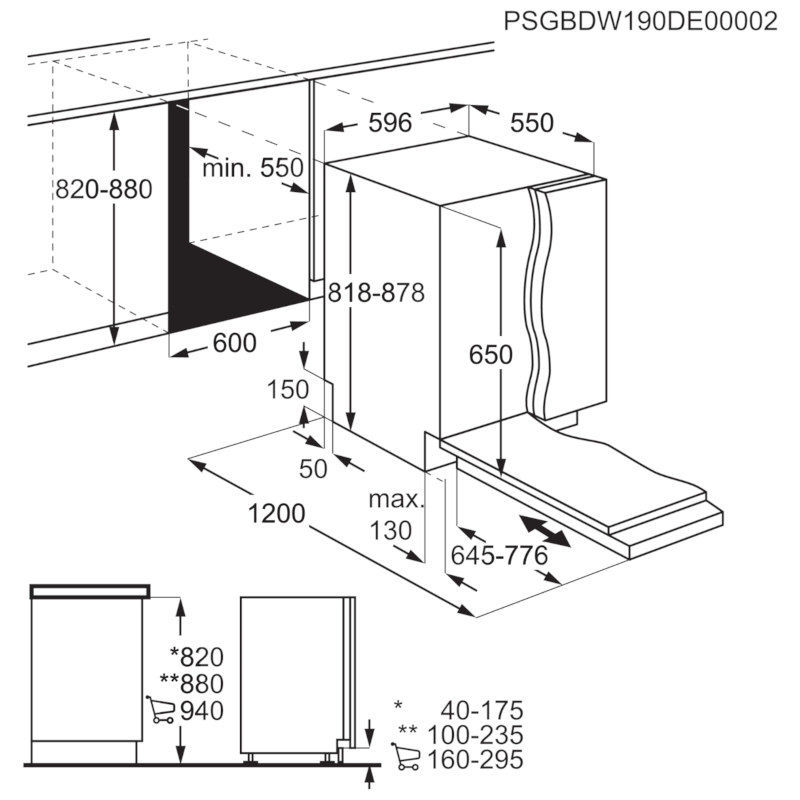 Dimenzije za ugradnju V(min/max)xŠxD (mm): 820/900 x 600 x 550