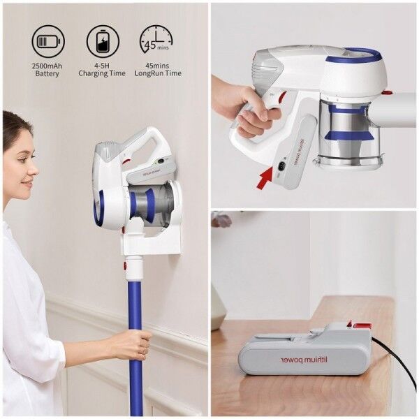 Pokreće ga baterija od 2.5 Ah, koja generira do 54Wh električne energije ili omogućuju do 45 minuta rada* u normalnom načinu rada, što je dovoljno za usisavanje cijelog stana. Također, baterija se može izvaditi i možete je zamijeniti drugom već napunjenom (dodatnu bateriju morate kupiti zasebno) i tako bez prestanka nastaviti s kućanskim poslovima.
